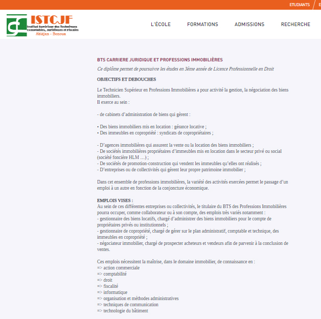 L’INSTITUT SUPÉRIEUR DES TECHNIQUES COMPTABLES, JURIDIQUES ET FISCALES (ISTCJF) est un Etablissement d’Enseignement Supérieur conçu et animé par des Enseignants des Universités et Grandes Ecoles en collaboration avec des professionnels. Le groupe ISTCJF dispose de deux campus de formation et de recherche à Abidjan Cocody et à Bonoua.