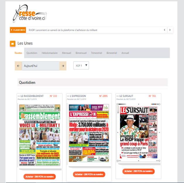 Pressecotedivoire est le portail d'informations du groupement des éditeurs de presse de Côte d'Ivoire regroupant trente-cinq (35) organes de presse en son sein, financé par le fonds de soutien de la presse (FSDP) .