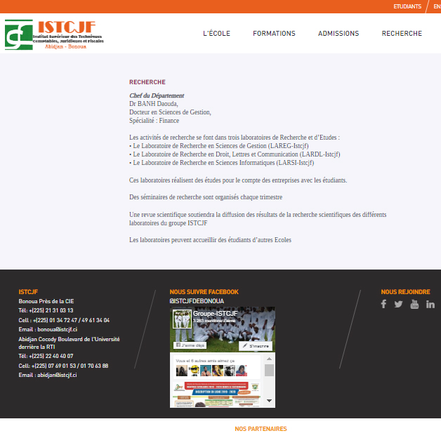 L’INSTITUT SUPÉRIEUR DES TECHNIQUES COMPTABLES, JURIDIQUES ET FISCALES (ISTCJF) est un Etablissement d’Enseignement Supérieur conçu et animé par des Enseignants des Universités et Grandes Ecoles en collaboration avec des professionnels. Le groupe ISTCJF dispose de deux campus de formation et de recherche à Abidjan Cocody et à Bonoua.